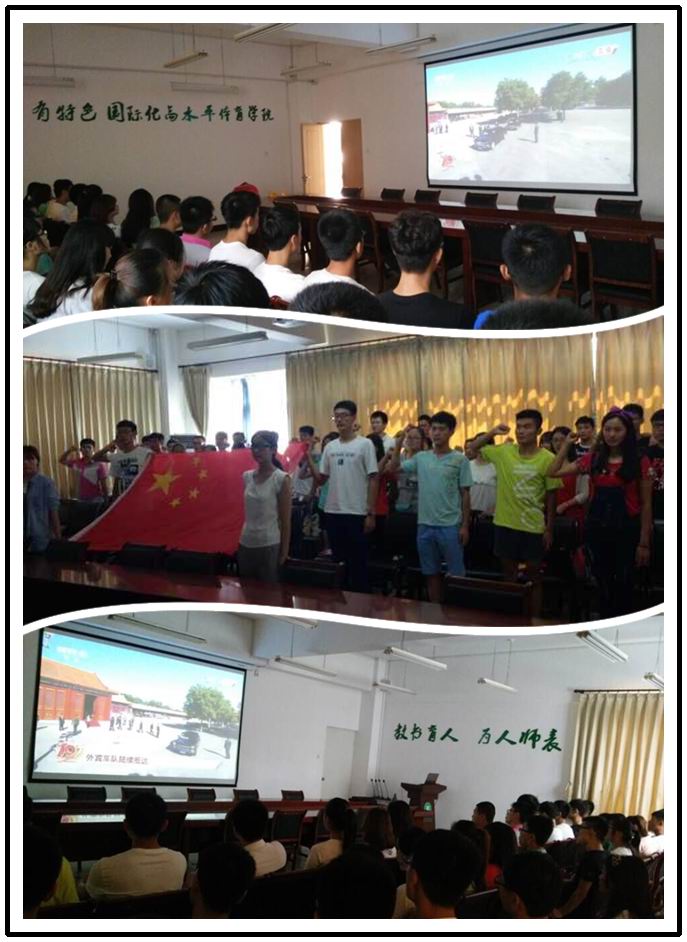 9月3日上午8:30,鲁东大学体育学院50多名学生代表在学院会议室集中收看了纪念中国人民抗日战争暨世界反法西斯战争胜利70周年大会及阅兵式,收看结束后学院举行了国旗下的宣誓活动,同学们深感震撼,倍感自豪,深受教育,纷纷表示一定要牢记历史,勿忘国耻,努力学习,学会感恩,报效祖国,做一名无愧于时代,无愧于人民的优秀大学生。(撰稿 吕沛瑶)