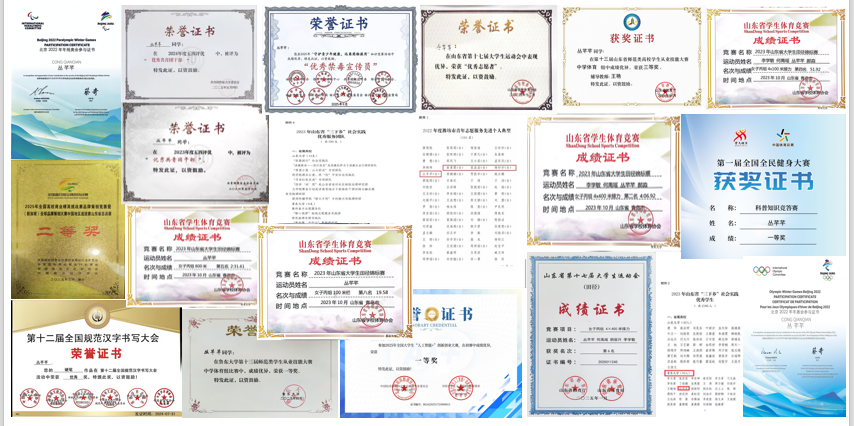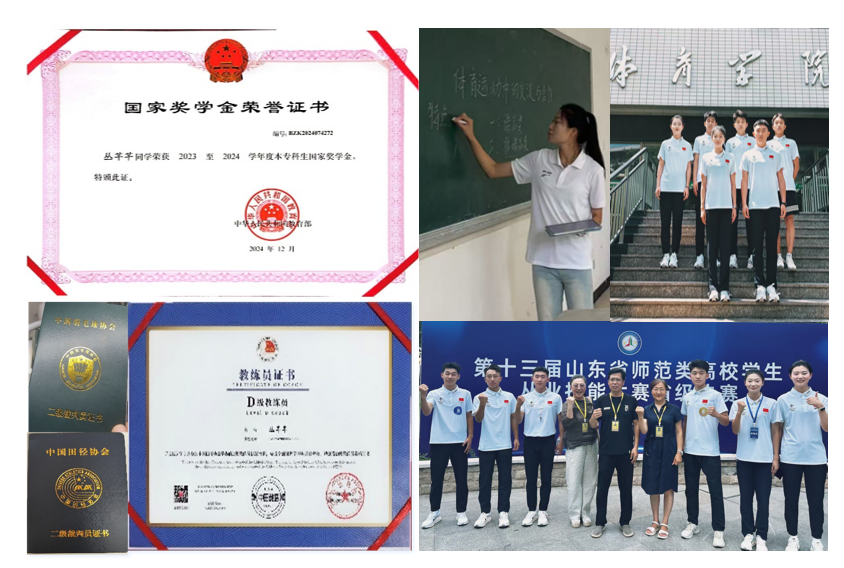 竞技赛场是她检验专业成色的“试金石”。在山东省大学生运动会等体育类专业竞赛中,她顽强拼搏,奋勇争先,为学校“斩获一金三银一铜”。从田径跑道到执裁岗位,她不断拓展专业边界,已考取国家二级田径裁判员、国家二级羽毛球裁判员、国家D级田径教练员等多项资质,累计执裁国家级、省级等各类赛事60余场,展现出勤勉、好学、善思的优异品质。