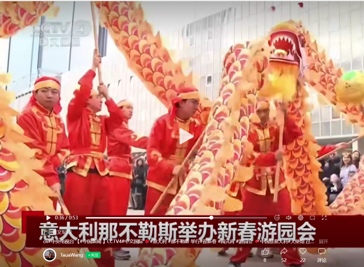 2026年2月28日,意大利那不勒斯新春园游会在那不勒斯市CENTRO DIREZIONALE广场隆重开幕,鲁东大学体育学院的学子们排练的舞龙舞狮表演作为开幕式节目率先登场,表演现场气氛热烈,吸引当地数万市民的驻足观看,欢呼声此起彼伏,精彩的舞龙表演让更多意大利民众近距离感受到中华传统文化的独特魅力。中央电视台中文国际频道对本次活动进行了相关报道。